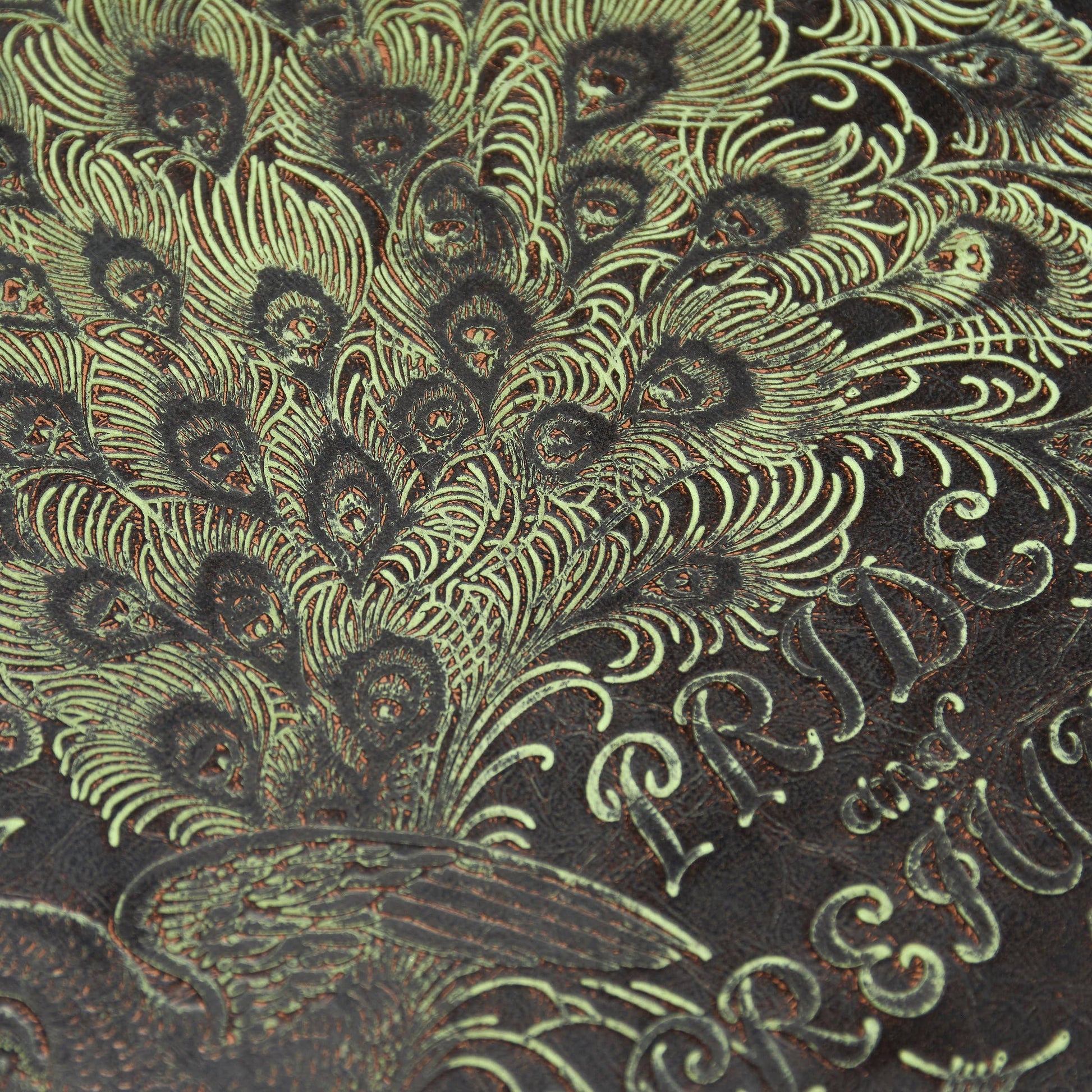 A decorative box from our Art Nouveau Collection displaying a book design inspired by art nouveau décor. Book box features a faux leather wrap displaying the exterior of a vintage "Pride And Prejudice" book with distressed accents and embossed details throughout an art nouveau inspired feather design. Vintage book box also displays a coordinating design on its side with embossed details for the "Pride And Prejudice" title, author, and illustrator giving the appearance of a book spine when on a shelf. Front cover opens to reveal a velvet lined space for storing items with a magnet closure for secure storage when standing up. Our Pride And Prejudice book box can be used upright on a bookshelf or laid flat with the cover open displaying decorative accents inside. A vintage home accent perfect for storing keepsakes in style or for everyday home décor displays.