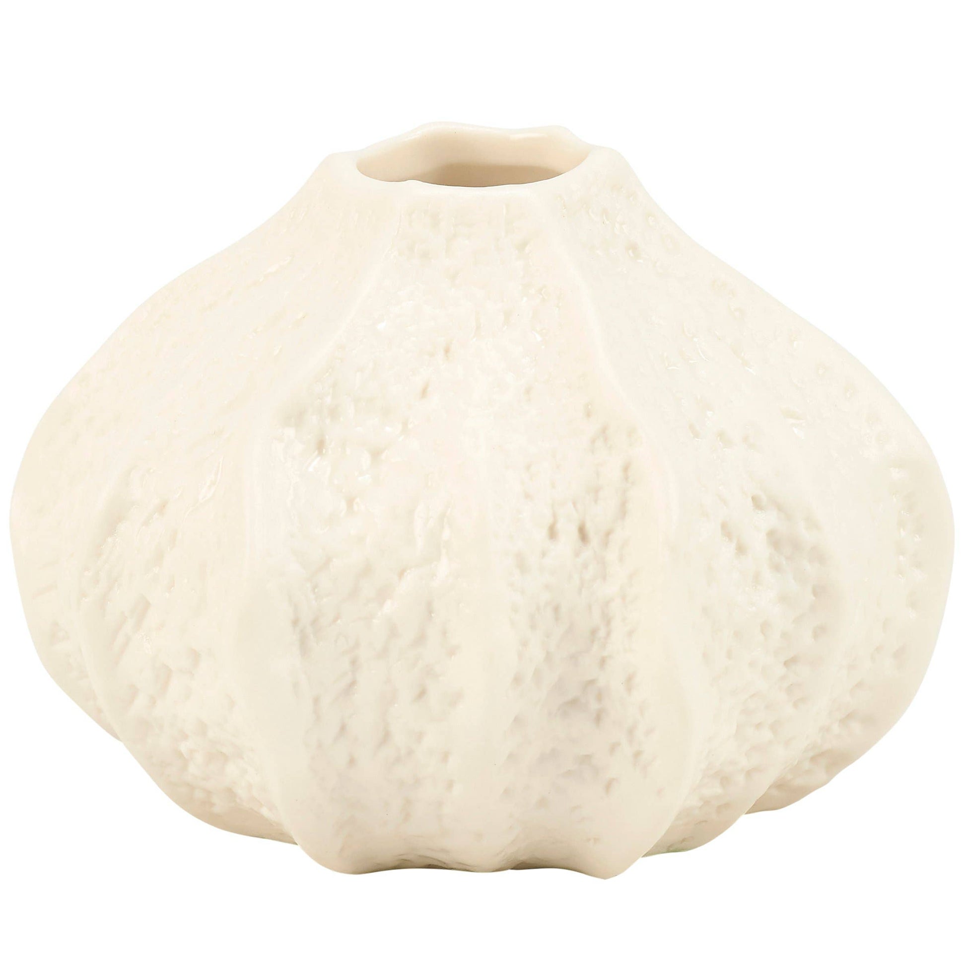 A small porcelain vase from our Beach Collection displaying a short sculpted sea urchin shape with cream finish. Our small Sea Urchin vase features opening on top to place greenery. Greenery pictured not included. A rustic beach-themed home accent with a variety of display options.
